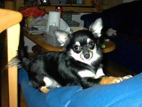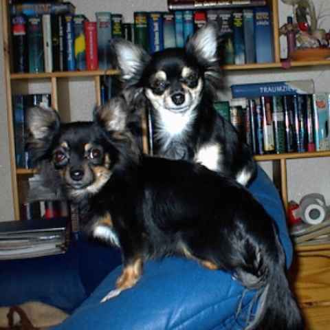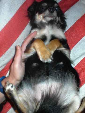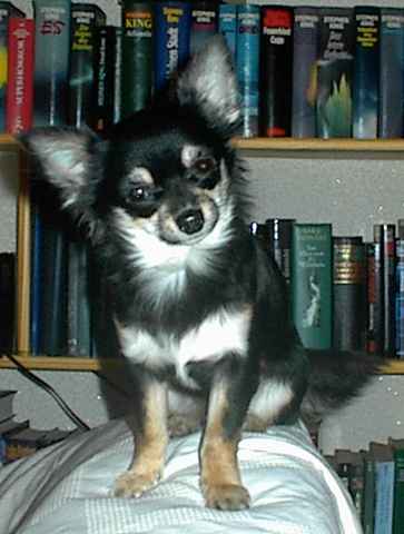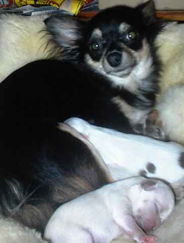 Verwandten und anderen Tieren viel Spaß hatte. "Mein Koboldkind" nenne ich sie oft, weil sie so lustig guckt :-)). Sie hat für ihre Größe ziemlich große Vorderpfoten und man hat den Eindruck, dass darin viel Kraft steckt. Wenn sie mit den anderen spielt, verteilt sie Watschen und wenn sie rennt, wirft sie diese Pfoten ganz seltsam durch die Gegend - Tara bringt einen immer zum Lachen! Ihre wahre Bestimmung erkannten wir schon, als Josy ihren letzten Wurf hatte. Kaum ließ Josy die Welpen mal allein, schon machte Tara es sich in ihrem Korb bequem, räumte mit ihren Pfoten alle Welpen an ihren Bauch und leckte sie ab. Kam Josy um die Ecke, wurde diese natürlich ziemlich sauer und biss Tara aus dem Korb, die dann zwar das Feld räumte, aber nur ......um hinter der nächsten Ecke zu warten und zu beobachten, ob Josy wieder verschwand. Diese Geschichte wiederholte sich dann den ganzen Tag. Tara ist die geborene Mama ! |
