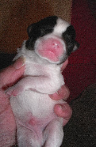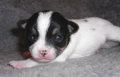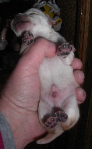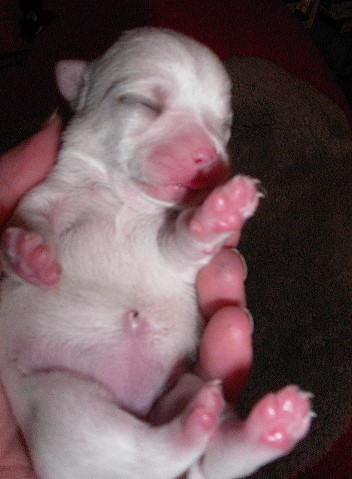| Obwohl die Welpen erst 1 Woche alt sind, hat sich doch schon eine Menge getan! Nicht nur, dass allesamt super zugenommen haben - auch in den Farben werden Veränderungen langsam sichtbar. Bei Hopefull Live und Handsome Hobbit erscheinen langsam Tan-Abzeichen; ebenso an den Wangen von Hole in One. Happy Dancing will offenbar seinem Namen alle Ehre machen und hat schon mal seine Tanzschuh mit Profilsohlen angezogen. |