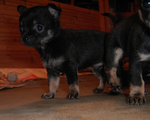 | Die Ausflüge und Spielphasen werden bereits länger, die "fast-feste" Mahlzeit wurde mittlerweile gegen Welpenfutter pur umgetauscht. Mama Tara lässt die Welpen jetzt schon mal ein bisschen allein, wenn sie schlafen. Sie kommt allerdings sofort zurück, wenn der erste einen Pieps von sich gibt. Mit 4 Wochen wurde auch schon mal Bekanntschaft mit der großen Schwester Dipsy gemacht - mit unterschiedlicher Begeisterung ;-) |