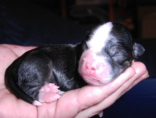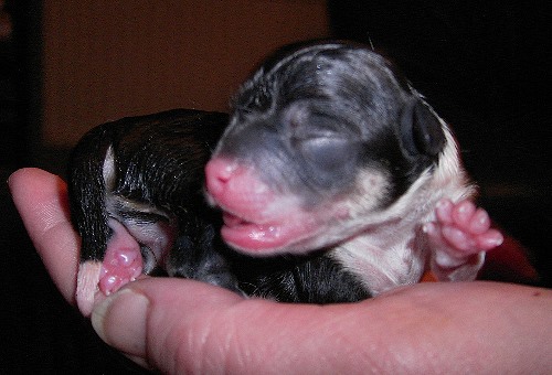 | Um 3:15 h war ein Rüde geboren. Ebenfalls schwarz mit weißen Abzeichen, aber im Gesicht kein weiß, aber angedeutete tan-Zeichen. Er wog 147 g und bekommt den Namen Obama : |