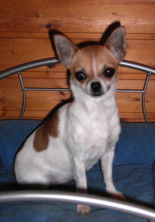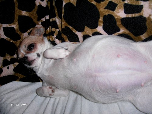 raus. Gegen 22:50 h zogen wir dann in die Wurfkiste um. Auch dort kein Buddeln, kein Hecheln. Sie presste sehr vorsichtig.....immer den Blick auf mich gerichtet. Offenbar hatte sie das Gefühl, ein Häuflein machen zu müssen und dachte vielleicht, dass ich sie schimpfen würde. Um 24:00 h erschien eine Vorblase, die von selbst platzte und hin und wieder kamen jetzt Presswehen. Um 2:10 h endlich hob sich ihre Rute und der Kopf eines Welpens erschien. Joyce gab sich viel Mühe und so dauerte es auch nicht lange, bis die kleine Ocean Queen geboren war. Ein Ebenbild von Papa Moody mit 135 g: |