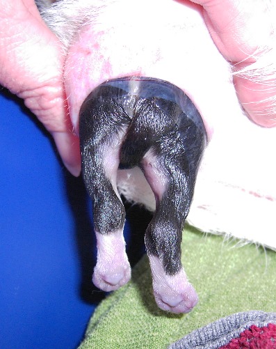 | Joyce kümmerte sich lieb um ihre beiden Erstgeborenen. Gegen 4:30 h fing sie wieder an zu pressen, aber es dauerte recht lange, bis um 5:00 h endlich die Hinterbeinchen eines Welpen zu sehen waren. Als die kleine Rute heraus war, sah ich schon, dass der kleine Mann bereits ein Häuflein abgesetzt hatte und seine Fußsohlen schneeweiß waren......ein sicheres Zeichen, dass dieser Welpe bereits tot war. Ich zog mit jeder Wehe fest mit, aber es ging kein Stück weiter. Joyce schrie und biss wild um sich. Erst dachte ich, dass das Welpchen vielleicht die Vorderbeine gestreckt hielt und dadurch im Geburtskanal feststeckte, aber auch als die Vorderbeine frei waren, ging es nicht weiter. Eine halbe Stunde zog ich feste, ohne den Kopf herauszubekommen. Eile war geboten, weil ja noch ein Welpchen drin wartete. |